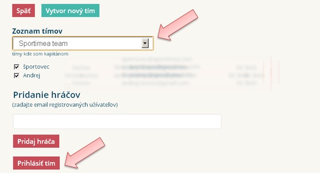 Vyberte zo zoznamu už vytvorených tímov, kde ste KAPITÁN. Zvoľte hráčov z tímu, ktorých prihlasuje na turnaj a prihláste tím.