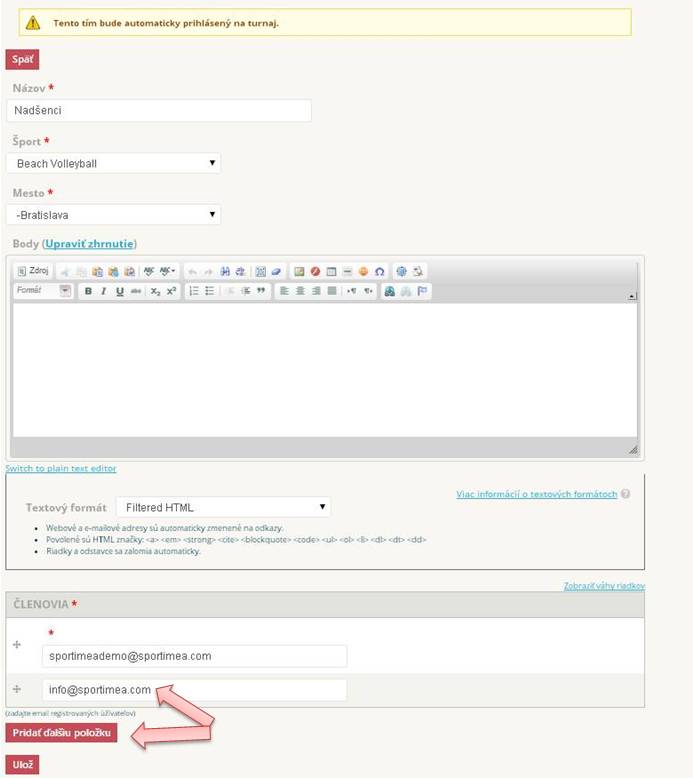 Tlačidlo "Ulož" vytvoríte tím a rovno ho prihlásite na turnaj.