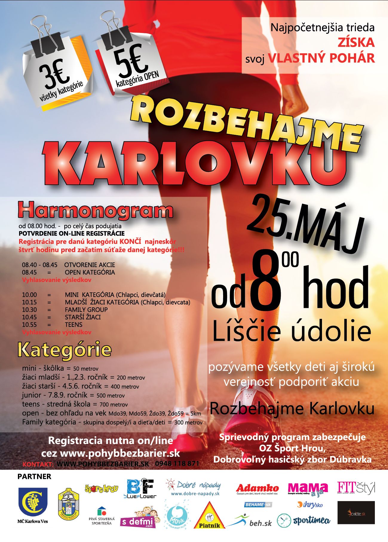 Včera bol pohodový deň a Sportimea si ho aktívne užila spolu so všetkými súťažiacimi na bežeckom podujatí Rozbehajme Karlovku v Líščom údolí, ktoré organizoval náš partner Pohyb bez bariér. Cieľom tejto akcie bolo podporiť deti v pohybe a motivovať ich k športu. Projekt mal zároveň aj integračný charakter, nakoľko súťažili aj zdravotne znevýhodnení. Súťažiaci boli rozdelení do jednotlivých kategórií na základe navštevovaného ročníka v škole. Dĺžka trate, ktorú museli bežci prebehnúť bola rôzna. Pre škôlkárov bola určená trať 50 metrov, školáci mali rôzne dĺžky trate od 200m - 700m, pre dospelých bola pripravená trať dlhá do 5 km. V skupinovej kategórii Family Group, v ktorej súťažili rodičia spolu so svojimi ratolesťami bolo dovolené, aby rodičia napomáhali deťom pri behu akýmkoľvek spôsobom. Pomôcť sme chceli aj my, a tak sme tam jednoducho nemohli chýbať a keď sme práve nepovzbudzovali, tak sme fotodokumentovali túto peknú akciu.